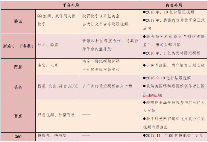 以BAT為首的機構(gòu)重金加速布局短視頻平臺。今日頭條、騰訊、秒拍等均投入10億元扶持短視頻內(nèi)容創(chuàng)業(yè)者。阿里投入20億元進軍短視頻領(lǐng)域,將土豆網(wǎng)打造為專門的短視頻平臺。騰訊專門成立短視頻中心,負責(zé)短視頻平臺運行;愛奇藝短視頻平臺的愛奇藝頭條正在內(nèi)測;秒拍成為新浪微博獨家短視頻應(yīng)用,從工具型短視頻機構(gòu)轉(zhuǎn)型為社交分享類短視頻平臺;華人文化基金領(lǐng)投的資訊類短視頻平臺梨視頻也已形成業(yè)內(nèi)影響力;咪咕視訊作為中國移動在視頻領(lǐng)域的唯一版權(quán)運營實體,也布局短視頻,與中央電視臺共建業(yè)內(nèi)領(lǐng)先的短視頻創(chuàng)作者聚集平臺,打造頭部賬號體系,孵化自有明星短視頻賬號,引入知名工作室直接簽約,盤整已有的強IP資源賬號化運作。
