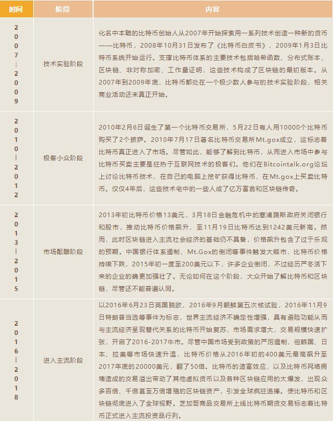 區(qū)塊鏈?zhǔn)怯梢幌盗屑夹g(shù)實現(xiàn)的全新去中心化經(jīng)濟組織模式,2009年誕生于比特幣系統(tǒng)的構(gòu)建,2017年成為全球經(jīng)濟熱點,但區(qū)塊鏈的成功應(yīng)用寥寥,這個新興產(chǎn)業(yè)還遠(yuǎn)未成熟。其發(fā)展大體可劃分為六個階段。