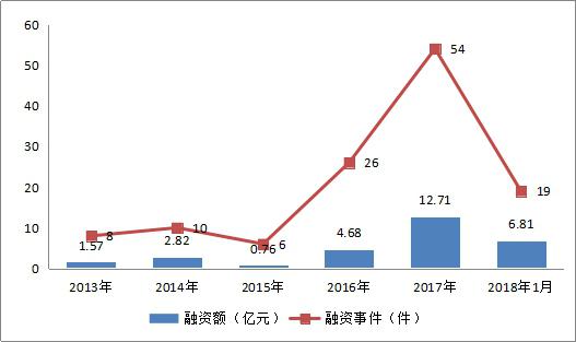 區(qū)塊鏈項目融資從2013年至2016年呈小幅上漲趨勢。由于2015年的政策監(jiān)管,導(dǎo)致2015年區(qū)塊鏈的投資熱度有所下降,在2017年VC大舉入局,投資額達(dá)12億。2018年1月,區(qū)塊鏈行業(yè)融資額和融資事件已經(jīng)超過2016年。