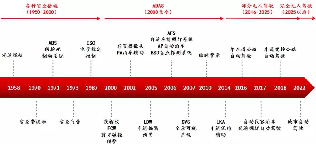 無人駕駛技術最初的發(fā)展從減少、防止機動車事故開始。從1950年至2000年,OEM車廠和Tier 1的零部件制造商對車輛發(fā)明、生產(chǎn)了許多結構性的改進。最核心的就是四大安全系統(tǒng):安全帶,防抱死制動系統(tǒng)(ABS),安全氣囊和電子穩(wěn)定控制(ESC)。