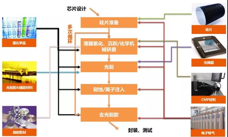 半導體制造材料是半導體制造過程中所需的材料,包含硅片、光刻膠、光掩膜、濺射靶材、CMP 材料、電子特氣、濕化學品、石英等細分子領域。半導體加工分為芯片設計、芯片制造和封裝測試三個環(huán)節(jié),半導體芯片制造過程中,所有工藝均在硅片襯底上進行,具體工藝包括前期硅片準備、薄膜氧化/沉積、化學機械研磨、光刻、刻蝕或離子注入、去光刻膠等步驟,以上步驟組成一個循環(huán)。一般半導體制造需要經(jīng)過十幾至幾十次循環(huán)才可全部加工完畢,進入下一輪的封裝測試環(huán)節(jié)。