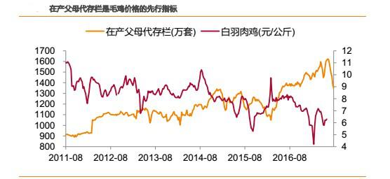 引種規(guī)模的下降意味著祖代存欄的下降,供給的減少將導致父母代雞苗銷售價格下降。由于2012年以前國內白羽肉雞需求快速增加,因此,國內白羽雞引種規(guī)增速的下降也會引起價格的上漲。例如,2010年的引種規(guī)模與2009年基本持平,僅增長3萬套。受此影響,父母代雞苗價格也從2010年9月份開始反彈。同樣的,隨著2014年引種規(guī)模的下降,父母代雞苗價格則從2014年3月見底回升,中間雖有波動,但從2015年10月即開始一輪快速上漲。也就是說,對于祖代產(chǎn)能的變化,父母代雞苗價格是一個重要的驗證指標。