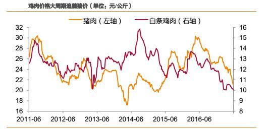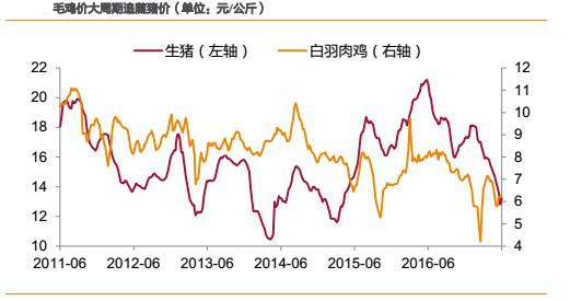 2)短周期內,受各自供求關系決定產(chǎn)品價格,則豬價、雞價走勢有可能會發(fā)生背離,但背離時間一般不會超過1個季度,且背離的時間一般出現(xiàn)在春節(jié)后的上半年。如2012年2月-4月,2014年2月-4月、2015 年3月-6月、2016年3月-6月、2017年2月-3月。
