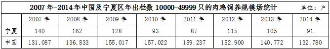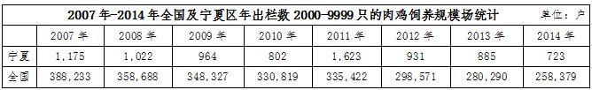 不僅如此,在肉雞飼養(yǎng)場的規(guī)模上也有明顯的差距。據(jù)wind數(shù)據(jù)統(tǒng)計,2014年,寧夏區(qū)內肉雞年出欄數(shù)在1-1999只的肉雞飼養(yǎng)規(guī)模場戶數(shù)為133734戶,當年全國同規(guī)模的飼養(yǎng)場戶數(shù)高達21644679戶,占比為0.62%;年出欄數(shù)在2000-9999只的肉雞飼養(yǎng)規(guī)模戶數(shù),寧夏地區(qū)為723戶,全國為258379戶,占比0.28%;年出欄數(shù)在10000-49999只的肉雞飼養(yǎng)規(guī)模戶數(shù),寧夏地區(qū)為91戶,全國為132780戶,占比為0.07%。