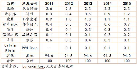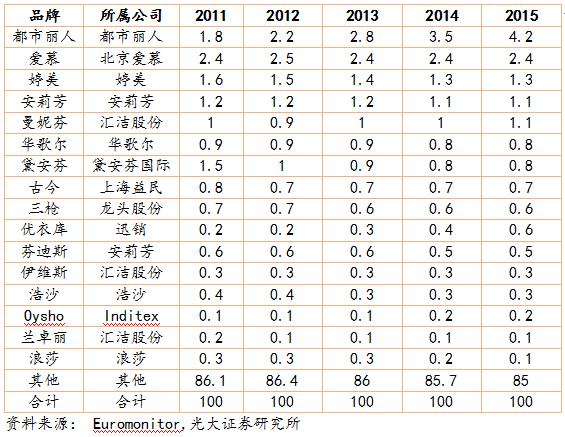 內(nèi)衣作為消費(fèi)者的第二層“肌膚”,消費(fèi)者對(duì)內(nèi)衣的消費(fèi)比其他成衣具備更強(qiáng)的忠誠度,進(jìn)入 21 世紀(jì)后,消費(fèi)者對(duì)內(nèi)衣品牌的認(rèn)可也越來越強(qiáng)。 雖然部分品牌由于品牌老化導(dǎo)致市占率降低,但是總體看,前 16 家女士內(nèi)衣品牌的市場份額從 2011 年的 13.9%提升到了 2015 年的 15%。前八大男士內(nèi)衣品牌的市占率從 5.4%提升到 6%。