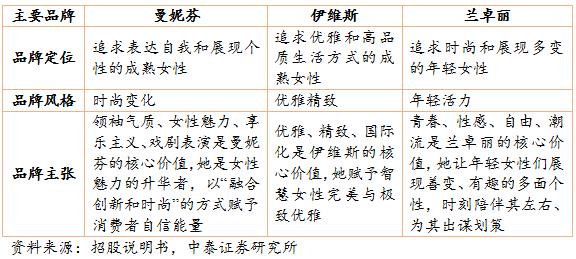公司實(shí)行多品牌運(yùn)作戰(zhàn)略,針對(duì)不同年齡段和不同風(fēng)格的消費(fèi)者推出三個(gè)中高端核心品牌“曼妮芬”、 “伊維斯”和“蘭卓麗”,三個(gè)副牌COYEEE、Bodybeauty 和喬百仕。其中,主打品牌“曼妮芬”連續(xù) 12 年市占率第一,其市占率長期領(lǐng)先于規(guī)模最大的內(nèi)衣公司安莉芳的主品牌“安莉芳”。第二大品牌“伊維斯”連續(xù)兩年市場份額排名前十。