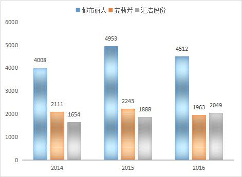 考慮到使用萊卡材料內(nèi)衣企業(yè)主要是中高端企業(yè),企業(yè)占市場份額較大,數(shù)據(jù)可獲取等因素,本部分主要針對(duì)中高端內(nèi)衣企業(yè)安莉芳集團(tuán)(以下簡稱為:安莉芳)、深圳匯潔集團(tuán)股份有限公司(以下簡稱為:匯潔股份)、大眾性企業(yè)廣東都市麗人實(shí)業(yè)有限公司(以下簡稱:都市麗人)進(jìn)行分析。