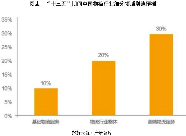 而高端物流服務(wù)增速將可以達(dá)到30%以上的增長(zhǎng)。供應(yīng)鏈管理、專(zhuān)業(yè)第三方物流和冷鏈服務(wù)等高端業(yè)態(tài)將迎來(lái)快速發(fā)展期,考慮到物流行業(yè)整體增速可以達(dá)到20%以及基礎(chǔ)物流服務(wù)增速僅在10%左右,預(yù)計(jì)“十三五”期間高端物流服務(wù)將可以迎來(lái)年均30%左右的持續(xù)增長(zhǎng)。