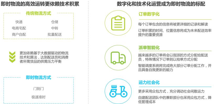 快速、及時(shí)、實(shí)時(shí)的物流實(shí)現(xiàn)路徑是“新零售” 的必備條件,即時(shí)物流在居民生活中扮演著越來(lái)越重要的角色,物流能力向下滲透觸及居民生活的方方面面,為衣食住行的全方位互聯(lián)網(wǎng)化提供現(xiàn)實(shí)基礎(chǔ),未來(lái)新零售趨勢(shì)下的即時(shí)需求比重會(huì)逐步增加。