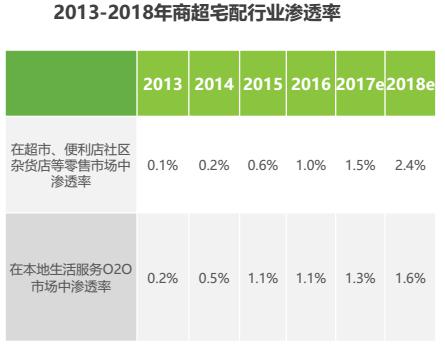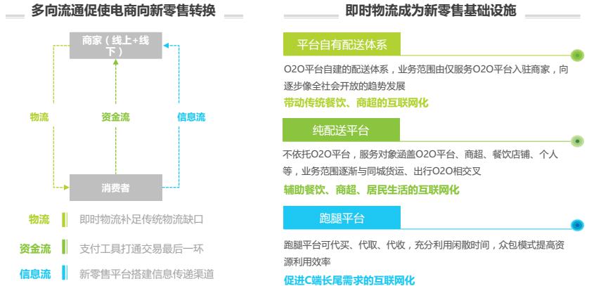 隨著商超宅配的興起和發(fā)展,即時(shí)物流在外賣(mài)配送之外找到了新的市場(chǎng)增長(zhǎng)點(diǎn)。目前商超宅配O2O行業(yè)滲透率較低,不足2%,但保持50%以上的年增長(zhǎng)率,成為即時(shí)物流新的增長(zhǎng)點(diǎn)。另外,“新零售”概念的提出,將通過(guò)數(shù)據(jù)和商業(yè)邏輯的深度結(jié)合,實(shí)現(xiàn)消費(fèi)模式的深刻變革,其中物流的價(jià)值和重要性日益凸顯。