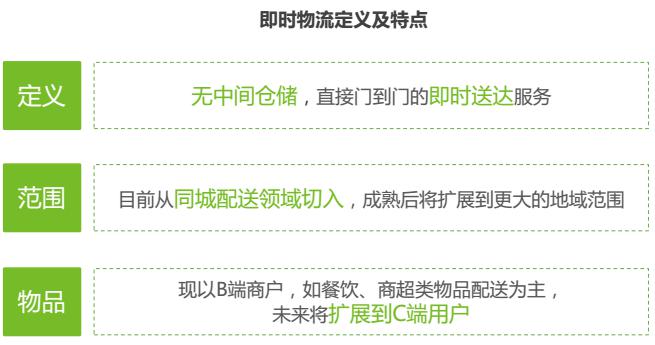即時(shí)物流在餐飲外賣(mài)等行業(yè)有所涉及。2009年,“即時(shí)物流”概念由點(diǎn)我達(dá)創(chuàng)始人趙劍鋒提出。2016年8月,點(diǎn)我達(dá)接受阿里巴巴近10億元投資,“即時(shí)物流”概念廣泛傳播。2016年11月召開(kāi)的互聯(lián)網(wǎng)大會(huì)上,美團(tuán)點(diǎn)評(píng)和餓了么相繼強(qiáng)調(diào)“即時(shí)配送”業(yè)務(wù)。區(qū)別于傳統(tǒng)物流方式,即時(shí)物流的核心特點(diǎn)在于即時(shí)性,滿(mǎn)足用戶(hù)提出的極速、準(zhǔn)時(shí)的配送要求。目前,即時(shí)物流以同城、小件領(lǐng)域切入,拓展到生鮮、商超配送領(lǐng)域,再逐步擴(kuò)展到更為廣泛的快遞末端領(lǐng)域。