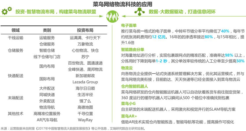 菜鳥(niǎo)網(wǎng)絡(luò)成立于2013年5月,定位于以數(shù)據(jù)驅(qū)動(dòng)、社會(huì)化協(xié)同的物流及供應(yīng)鏈平臺(tái)。主要業(yè)務(wù)有倉(cāng)配網(wǎng)絡(luò)、跨境網(wǎng)絡(luò)、快遞平臺(tái)和ET.物流實(shí)驗(yàn)室,以覆蓋全國(guó)的倉(cāng)配網(wǎng)絡(luò)和大數(shù)據(jù)決策平臺(tái)為基礎(chǔ),構(gòu)建專(zhuān)業(yè)高效的供應(yīng)鏈服務(wù)。為了提高網(wǎng)絡(luò)效率,一方面菜鳥(niǎo)以投資參股的形式構(gòu)建菜鳥(niǎo)聯(lián)盟,另一方面加大科技研發(fā)的投入,積極布局智慧物流。
