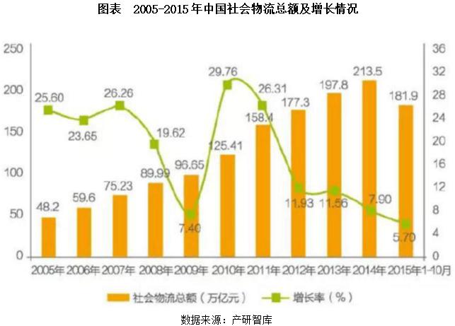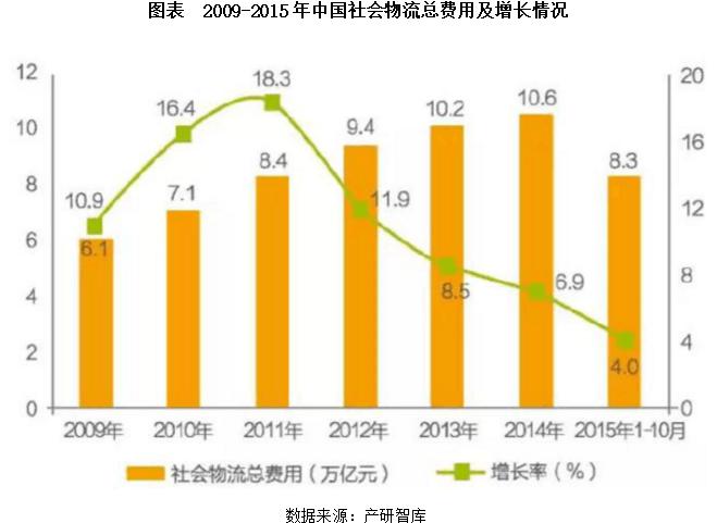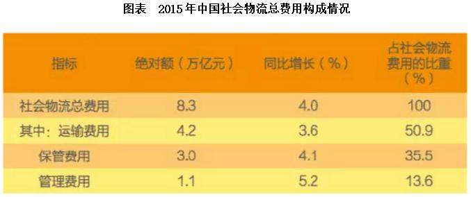 2014年社會(huì)物流總費(fèi)用10.6萬(wàn)億元,同比增長(zhǎng)6.9%。社會(huì)物流總費(fèi)用與GDP的比率為16.6%,比上年下降0.3個(gè)百分點(diǎn)。其中,運(yùn)輸費(fèi)用5.6萬(wàn)億元,同比增長(zhǎng)6.6%,占社會(huì)物流總費(fèi)用的比重為52.9%;保管費(fèi)用3.7萬(wàn)億元,同比增長(zhǎng)7.0%,占社會(huì)物流總費(fèi)用的比重為34.9%;管理費(fèi)用1.3萬(wàn)億元,同比增長(zhǎng)7.9%,占社會(huì)物流總費(fèi)用的比重為12.2%。