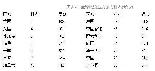 國(guó)家的物流業(yè)總體競(jìng)爭(zhēng)力不僅取決于基礎(chǔ)設(shè)施建設(shè)水平,還取決于整個(gè)物流產(chǎn)業(yè)的管理水平、第三方物流企業(yè)發(fā)展水平和第四方物流企業(yè)的整合能力。從國(guó)家層面來(lái)看,世界銀行發(fā)布的報(bào)告顯示,在全球物流業(yè)競(jìng)爭(zhēng)力排行榜(Logistics Performance Index)中,歐洲國(guó)家表現(xiàn)最為突出,前20名中超過(guò)60%的企業(yè)來(lái)自歐洲,亞洲物流業(yè)競(jìng)爭(zhēng)力最強(qiáng)的國(guó)家/地區(qū)是日本(排名第十),其次為中國(guó)香港和臺(tái)灣地區(qū),中國(guó)大陸在全球僅排名第28??傮w而言,發(fā)展中國(guó)家在基礎(chǔ)設(shè)施、國(guó)際運(yùn)輸、物流能力、交貨及時(shí)性等方面還與歐美等發(fā)達(dá)國(guó)家存在較大的差距,物流業(yè)的全球競(jìng)爭(zhēng)能力還十分有限。