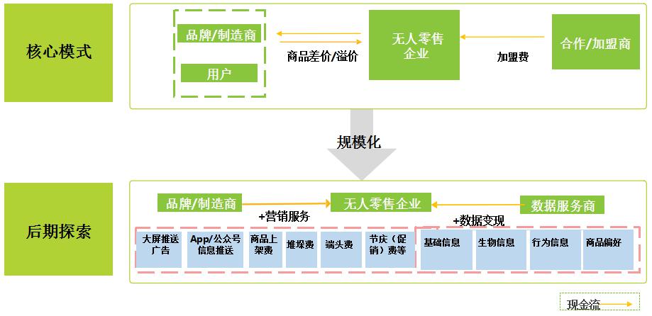 無(wú)人零售企業(yè)收入來(lái)源以銷售商品賺取差價(jià)為主,并且通過(guò)規(guī)模化提高議價(jià)能力降低采購(gòu)成本。此外,從加盟商獲取加盟費(fèi)用的商業(yè)模式也已經(jīng)開(kāi)始推行。無(wú)人零售發(fā)展至中后期,企業(yè)數(shù)據(jù)更為龐大,其盈利模式將隨之產(chǎn)生更多的想象空間,以互聯(lián)網(wǎng)思路開(kāi)展?fàn)I銷服務(wù)、數(shù)據(jù)變現(xiàn)等都是比較成熟的可參考模式。