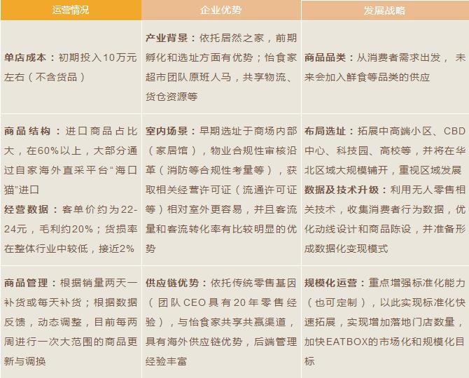 EATBOX由居然之家于2017年7月推出,定位于中高端小區(qū)、高校、CBD及科技園等。EATBOX 首店面積約30平米,設(shè)有9個(gè)貨架、2臺(tái)冰柜,主要銷售零食、飲料酒水、日化等商品,SKU約600~700個(gè),進(jìn)口商品SKU約400個(gè)。